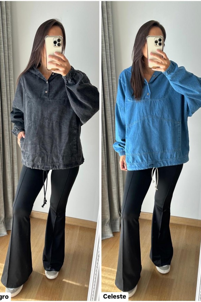 BUZO DE JEAN TELA: jean TALLE UNICO: Contorno de busto: 126 cm. Sisa: 29 cm. Largo: 70 cm. ABARCA HASTA UN TALLE 4 APROX. Debido al proceso de prelavado las medidas y tonos pueden variar.
