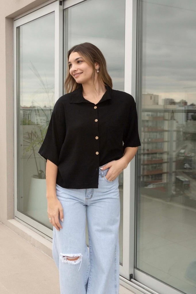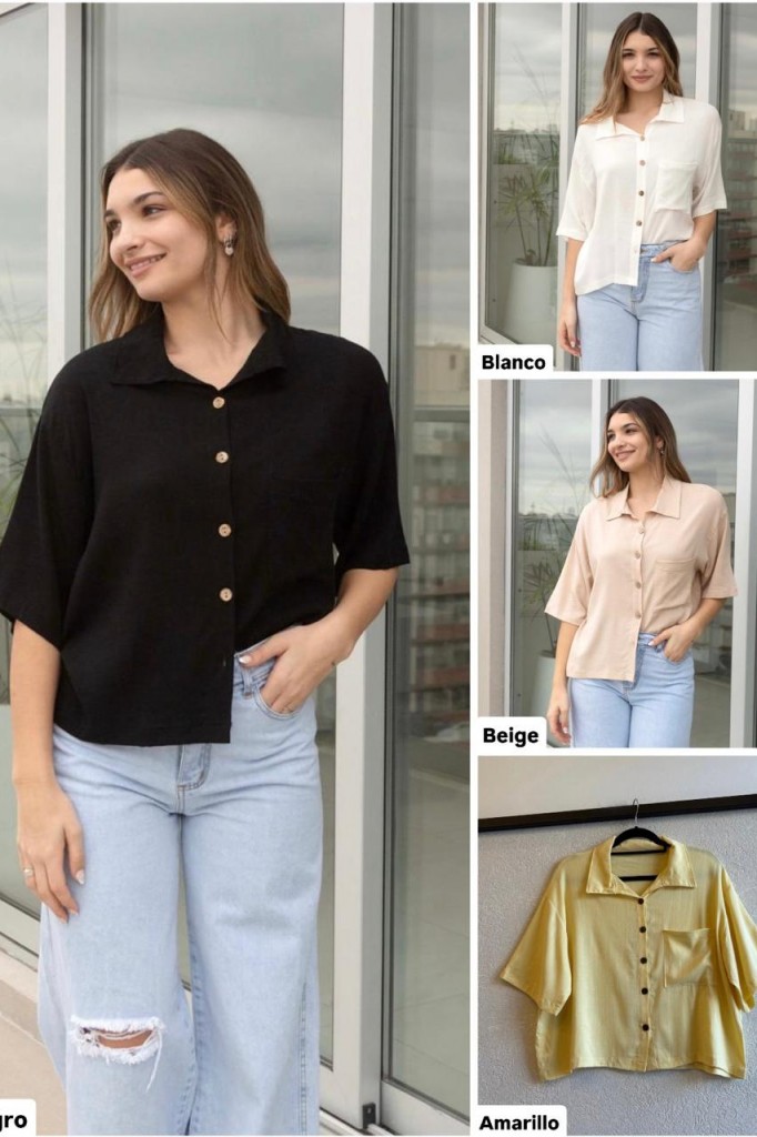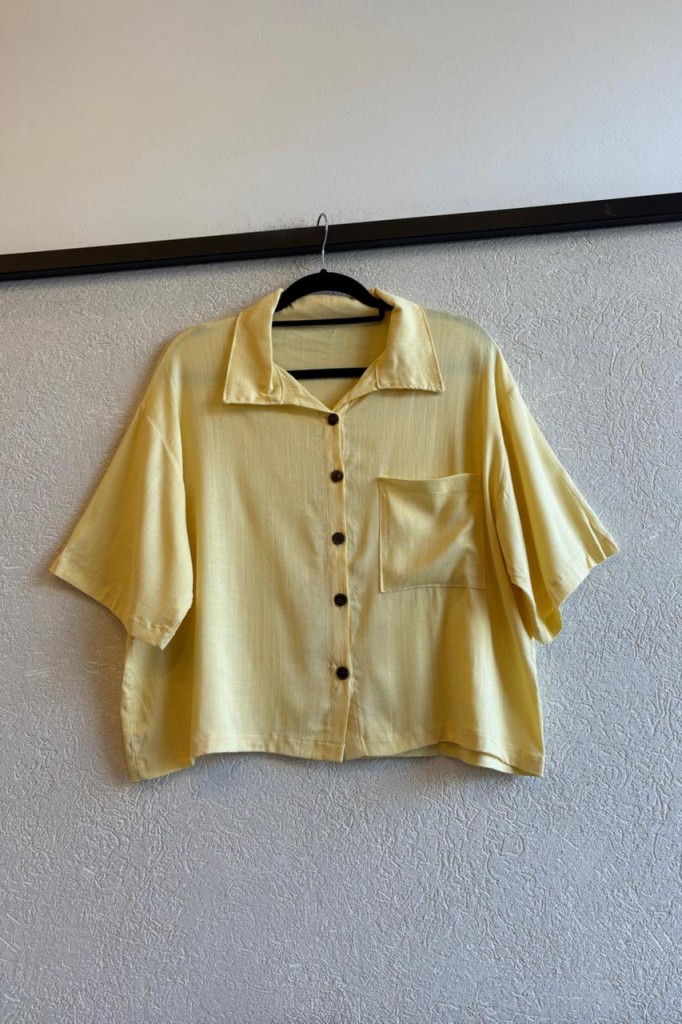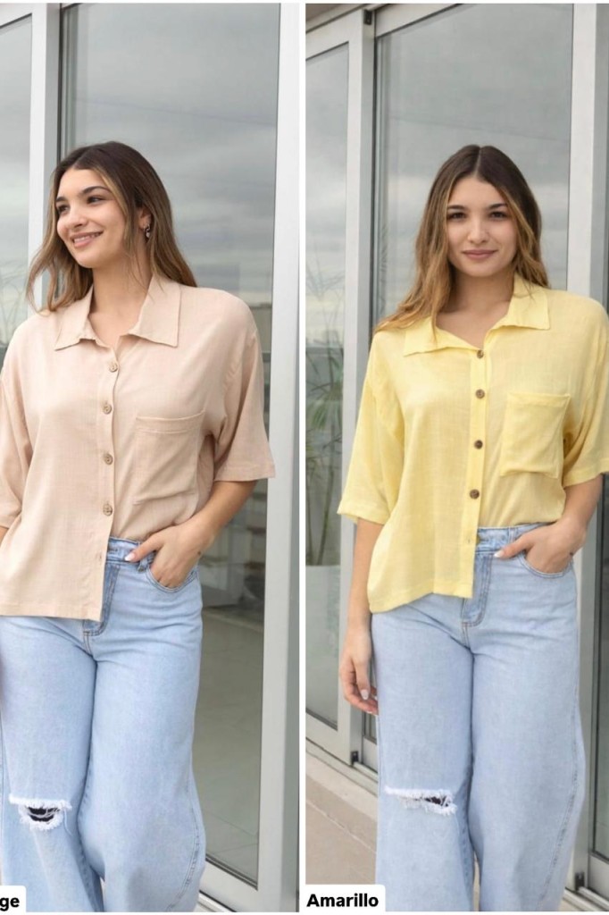 CAMISA CORTA DE LINO TELA: lino TALLE UNICO: Contorno de busto: 126cm. Sisa: 31cm. Largo: 56 cm. Abarca hasta un 5 aprox. Las medidas son aproximadas y pueden tener variaciones.
