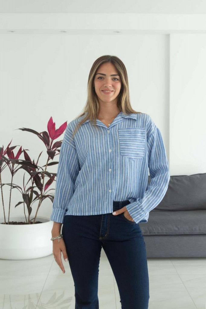 CAMISA CORTA DE LINO RAYADO TELA: lino TALLE UNICO: Contorno de busto: 110 cm. Sisa: 23 cm. Largo delantero:55 cm. Largo trasero:59cm Abarca hasta un 4/5 aprox. Las medidas son aproximadas y pueden tener variaciones.