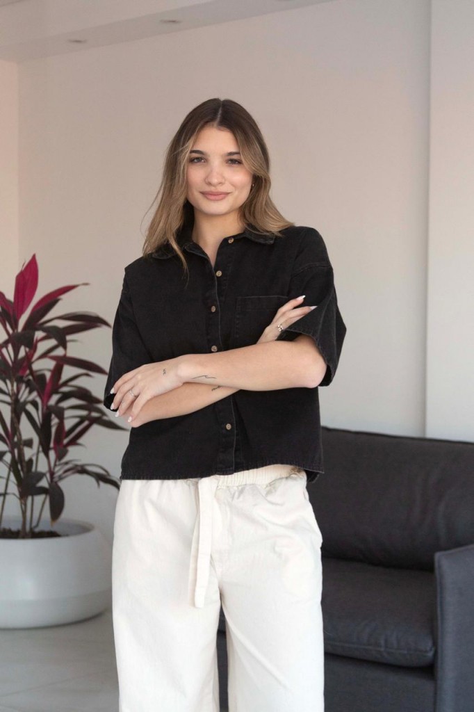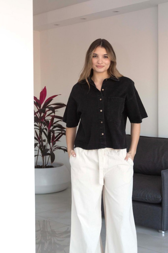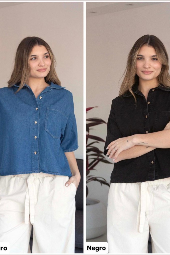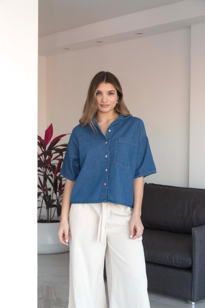 CAMISA DE JEAN JULIA TELA: jean TALLE UNICO: Contorno de busto: 114 cm. Sisa: 24 cm. Largo: 57 cm ABARCA HASTA UN TALLE 4 APROX. Debido al proceso de prelavado las medidas y tonos pueden variar.