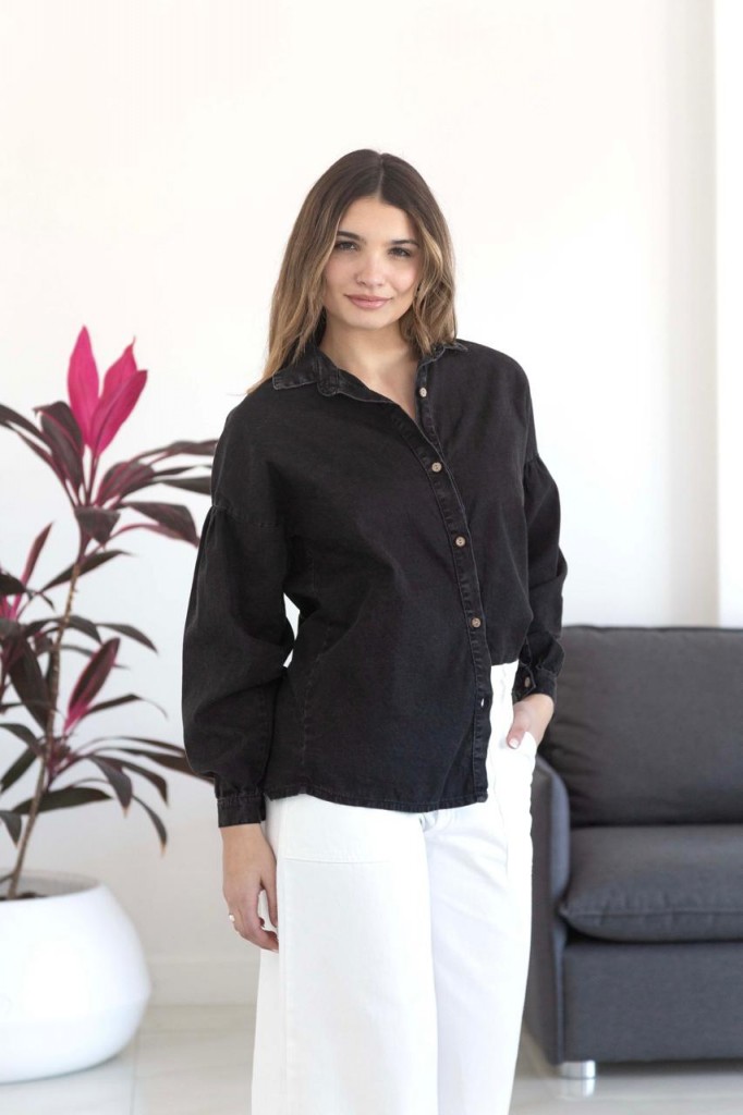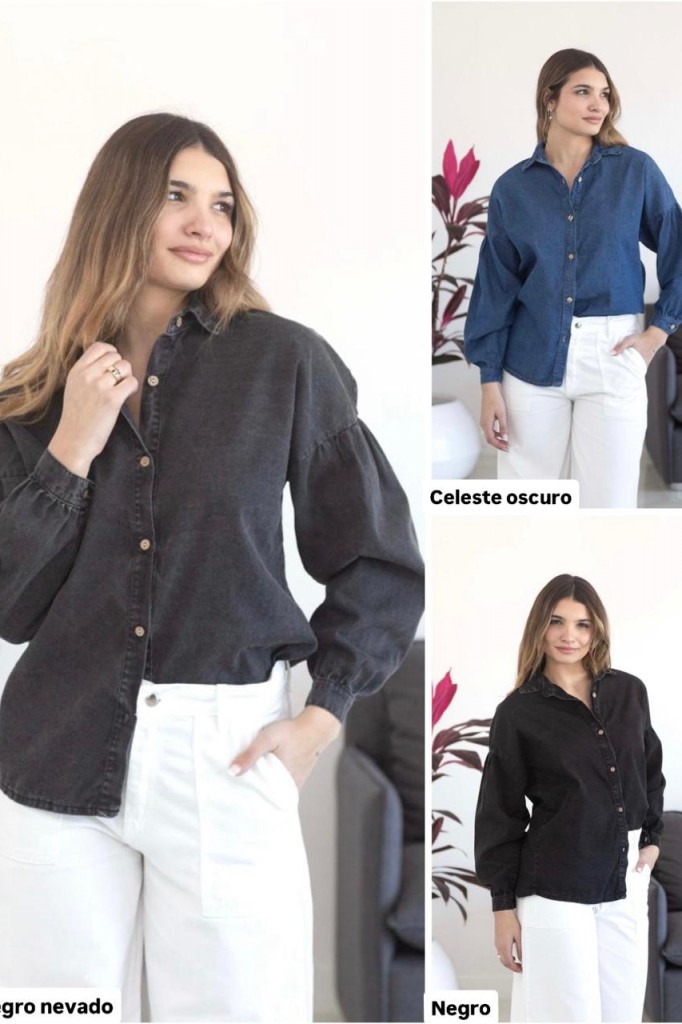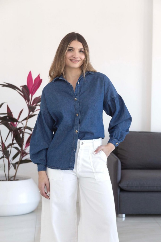 CAMISA DE JEAN MANGA GLOBO TELA: jean TALLE UNICO: Contorno de busto: 100 cm. Sisa: 22 cm. Largo: 71 cm ABARCA HASTA UN TALLE 4 APROX. Debido al proceso de prelavado las medidas y tonos pueden variar.