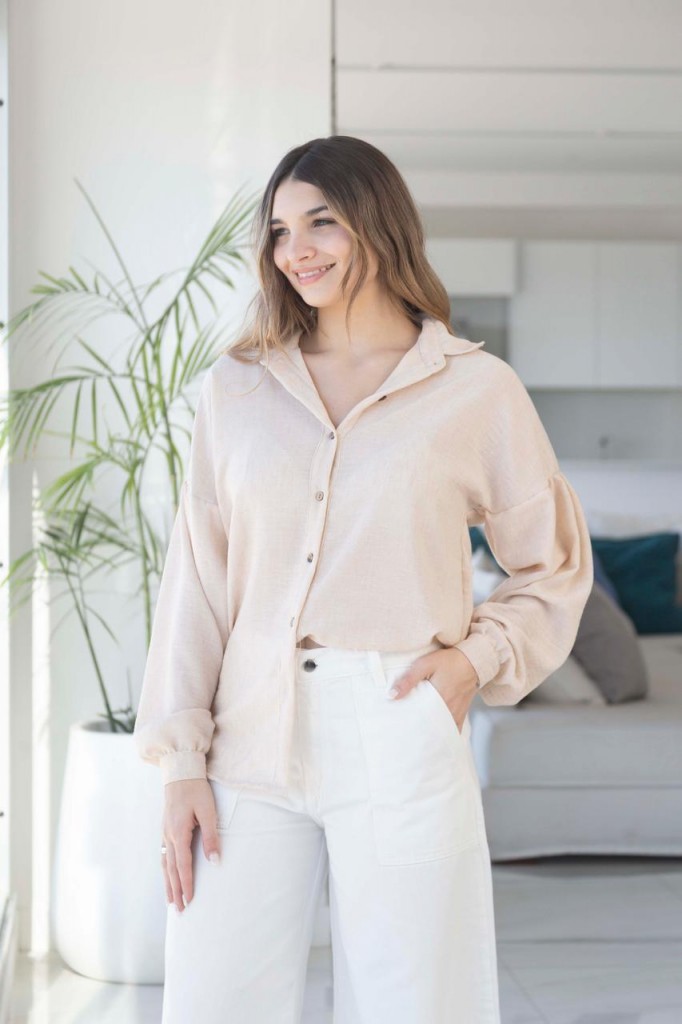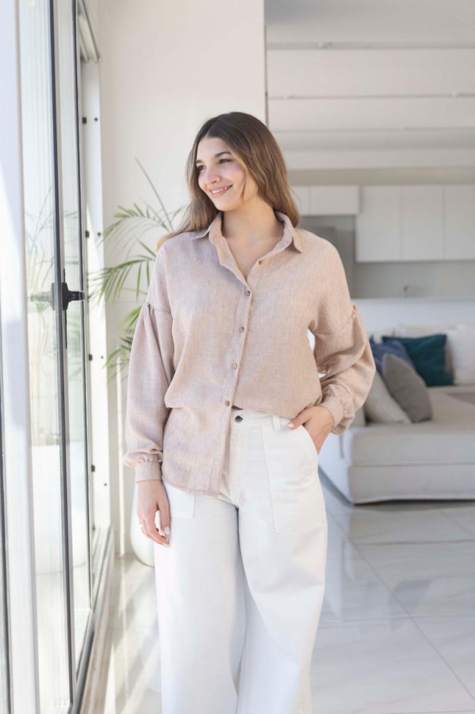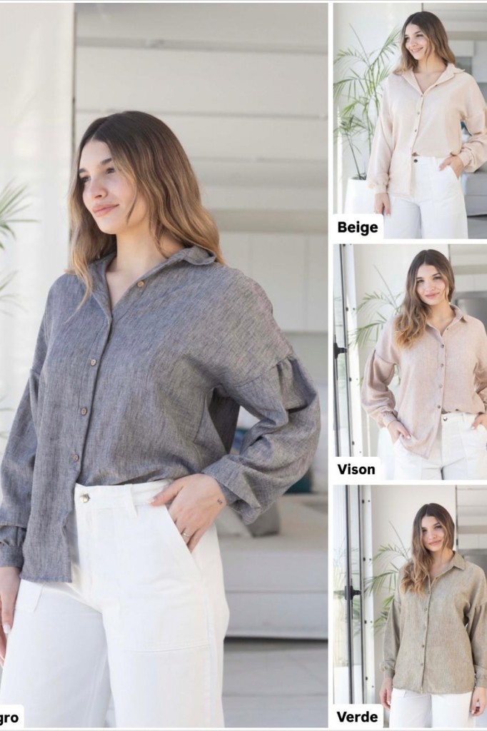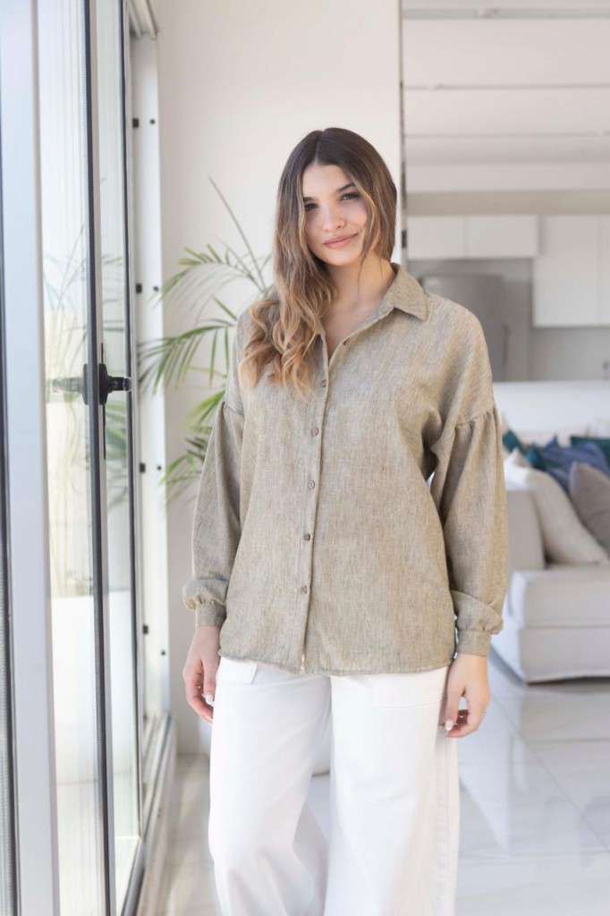 CAMISA MORA TELA: lino melange TALLE UNICO: Contorno de busto: 110 cm. Sisa: 27 cm. Largo delantero: 66 cm. Largo trasero: 68 cm ABARCA HASTA UN TALLE 4 APROX. Las medidas son aproximadas y pueden tener variaciones.