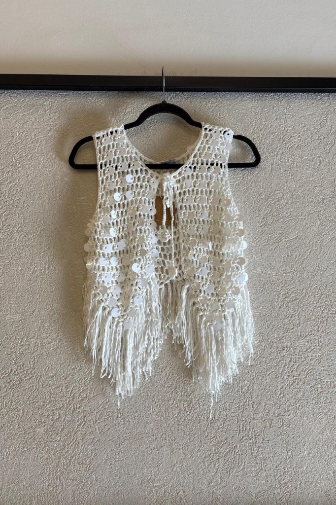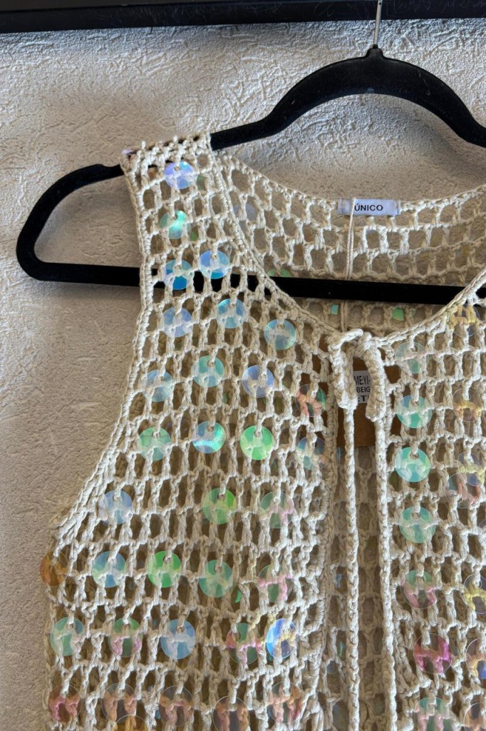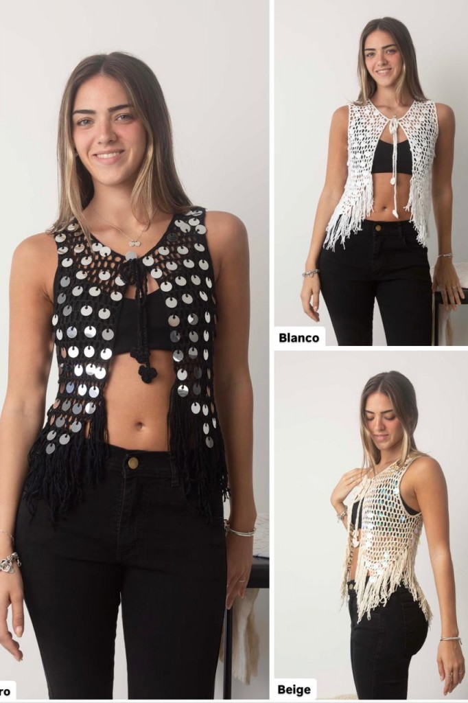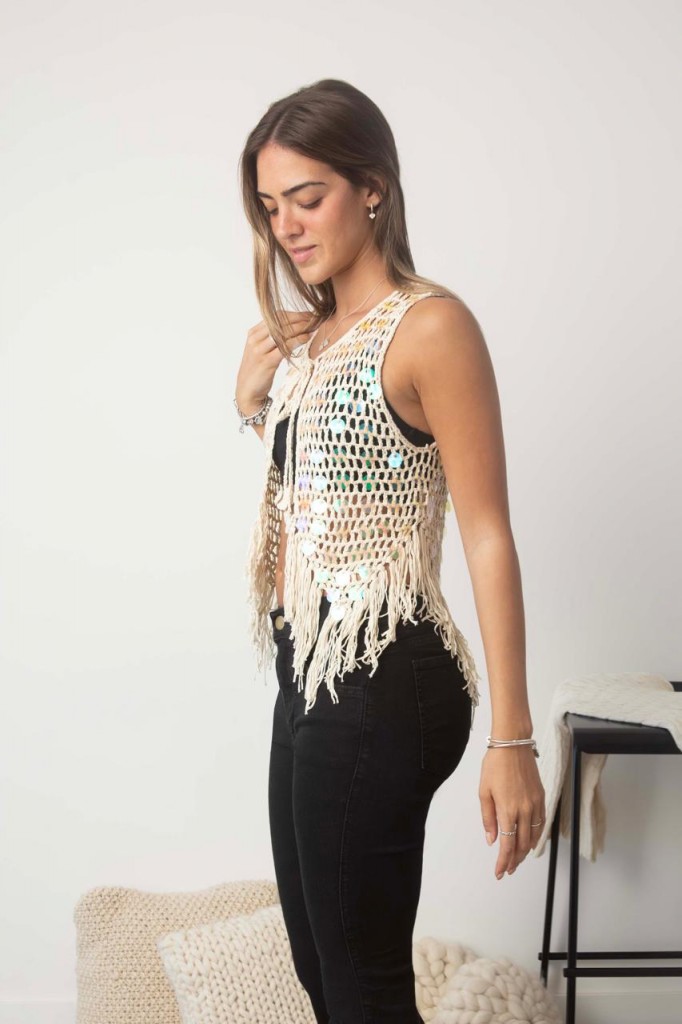 CHALECO FLECOS TALLE UNICO: Contorno de busto: 80 cm. Sisa: 25 cm. Largo: 45 cm Las medidas son aproximadas y pueden tener variaciones