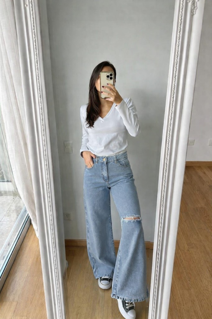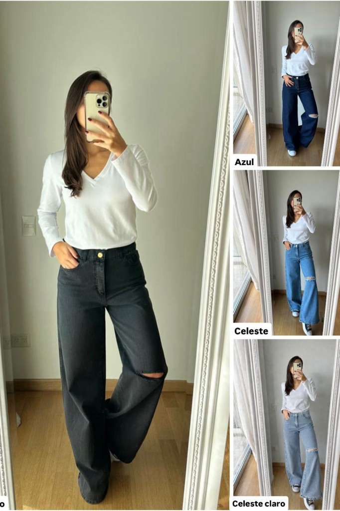 JEAN WIDE CON ROTURA ATENCION !!!!!!: EL COLOR NEGRO GASTADO TIENE UN CALCE MAS CHICO. TE RECOMENDAMOS ELEGIR 1 O 2 TALLES MAS. Tela: jean rigido