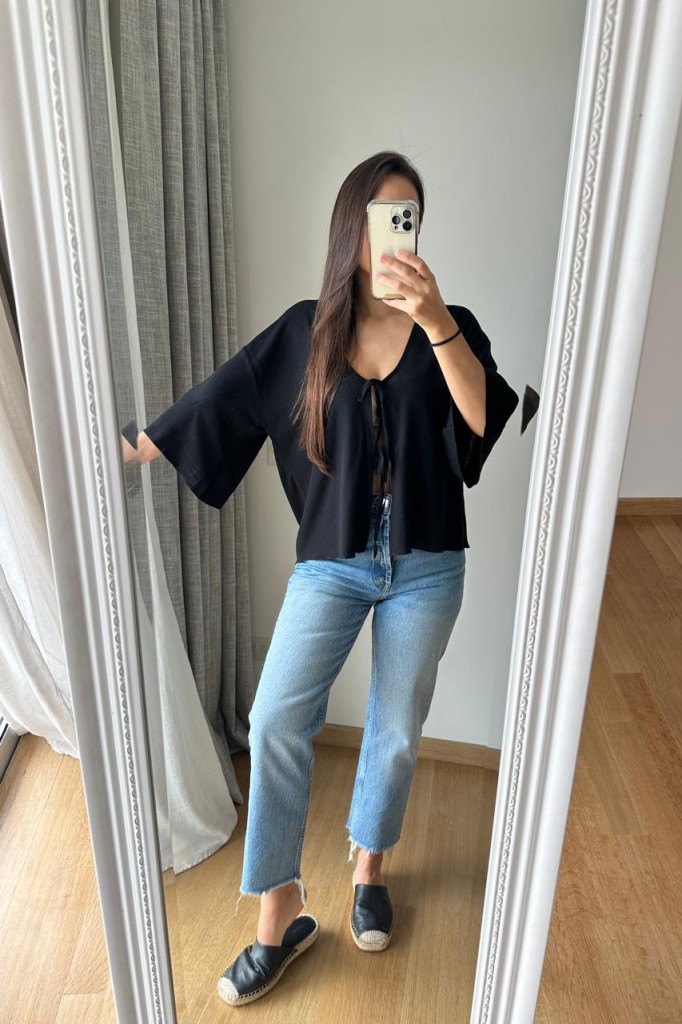 KIMONO CORTO TIRITAS TELA: lino elastizado TALLE UNICO: Contorno de busto: 120 cm. Sisa: 26 cm. Largo: 64 cm. Abarca hasta un 3/4 aprox. Las medidas son aproximadas y pueden tener variaciones