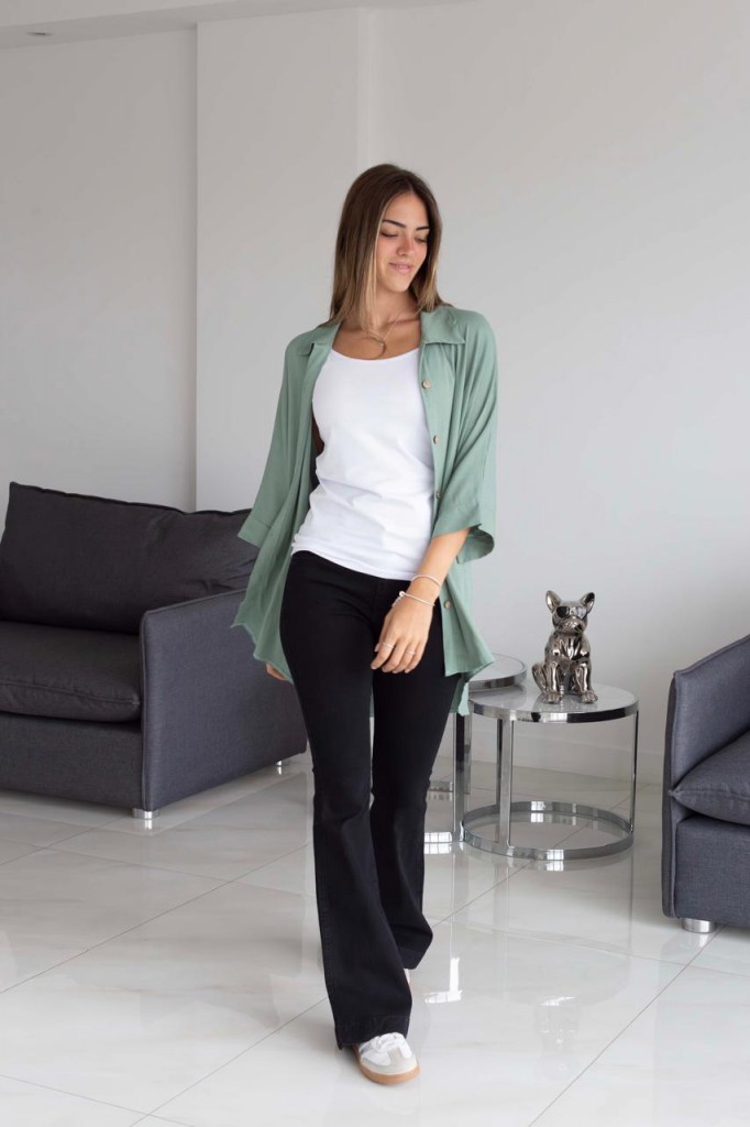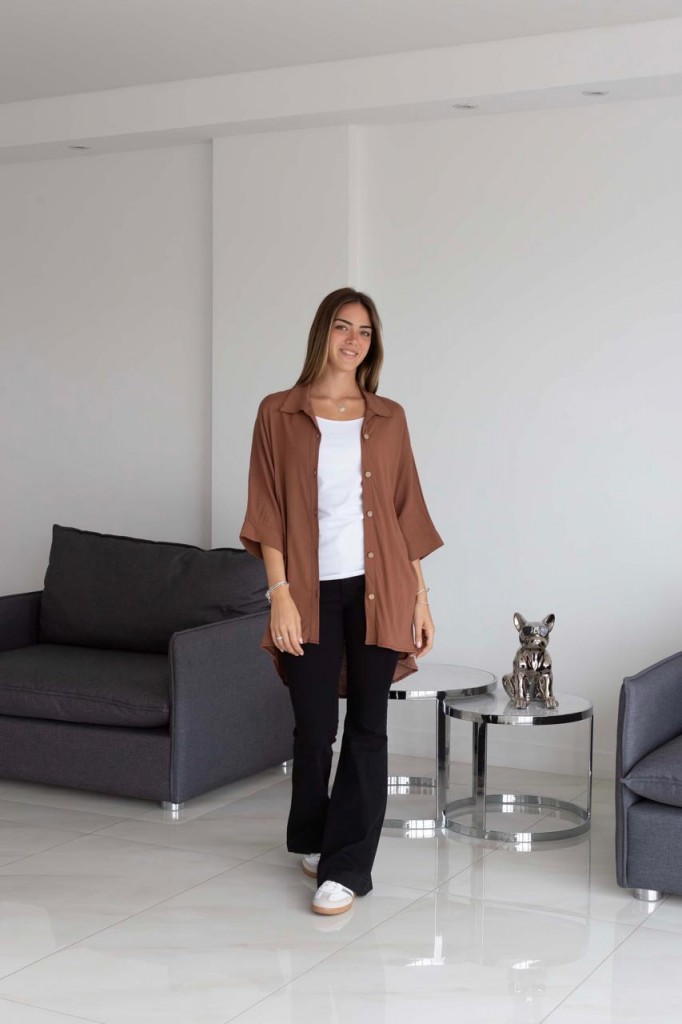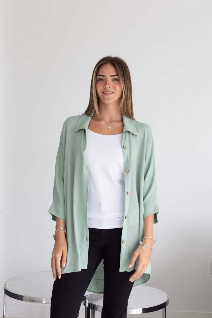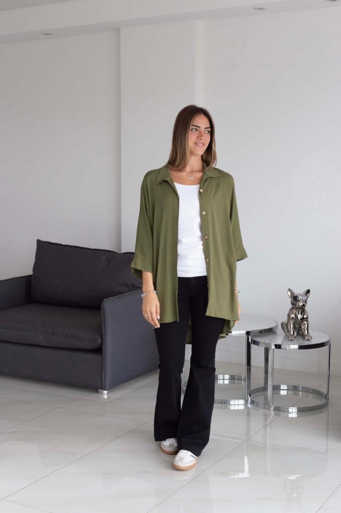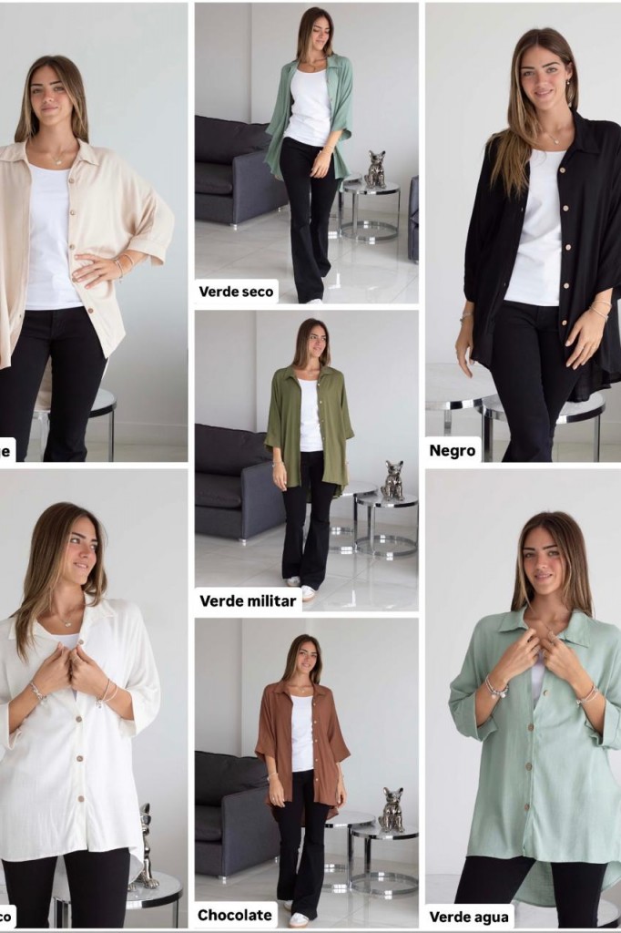 MAXI CAMISA DE LINO TELA: lino elastizado TALLE UNICO: Contorno de busto: 140 cm. Sisa: 39 cm. Largo delantero: 75 cm. Largo trasero: 88 cm. ABARCA HASTA UN TALLE 6 APROX. Las medidas son aproximadas y pueden tener variaciones.