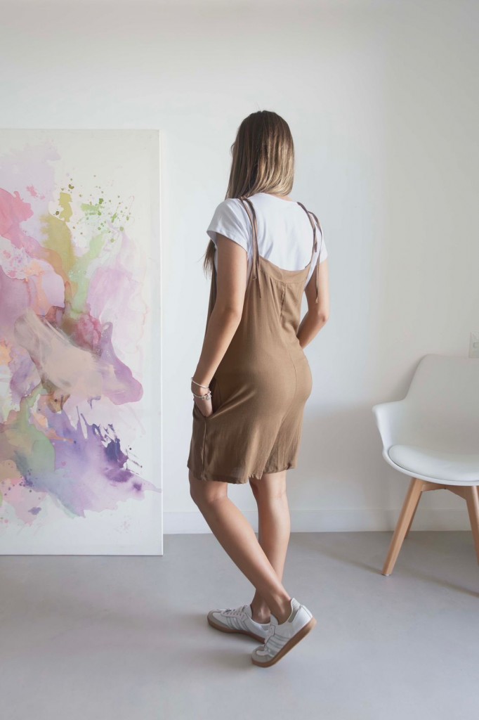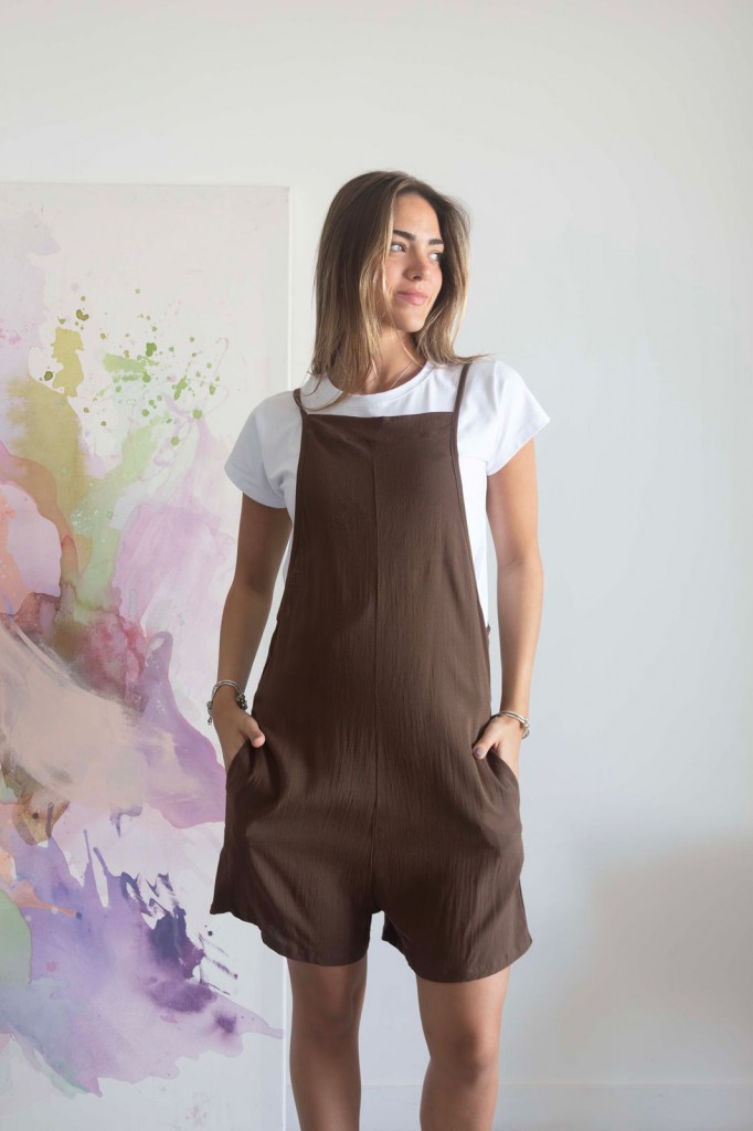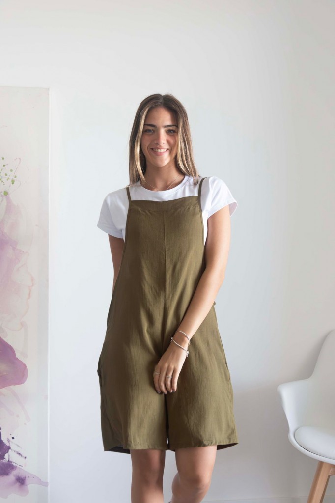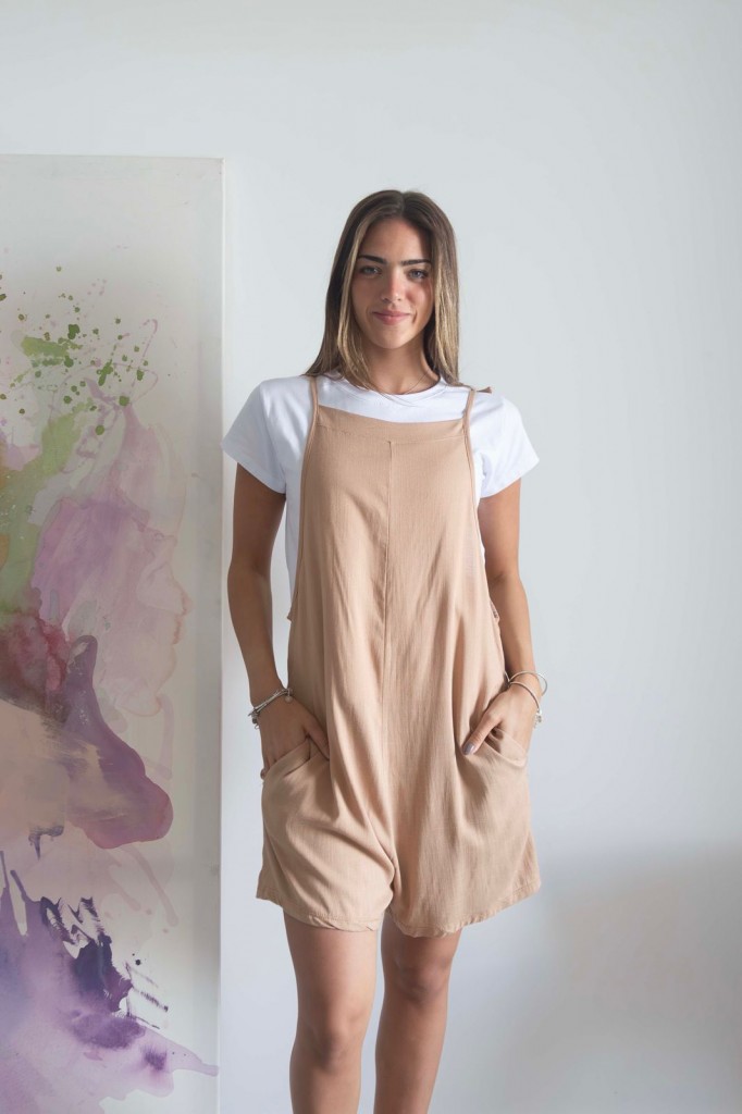 MONO CORTO DE LINO TELA: lino. TALLE UNICO: Contorno de busto: 110 cm. Largo: 74 cm. Tiene tiras regulables y bolsillos Las medidas son aproximadas y pueden tener variaciones.