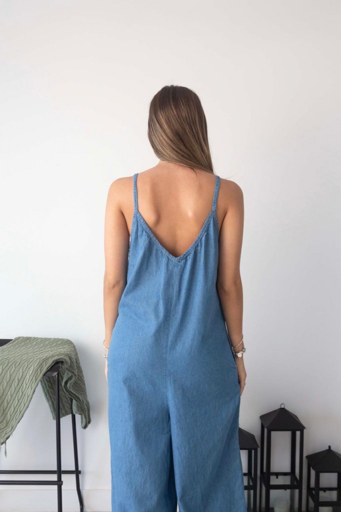 MONO LARGO DE JEAN TELA: jean liviano TALLE UNICO: Contorno de busto: 114 cm. Sisa: 35 cm. Largo con bretel: 149 cm. Abarca hasta un 44 aprox. de jean. Debido al proceso de prelavado las medidas y tonos pueden variar.