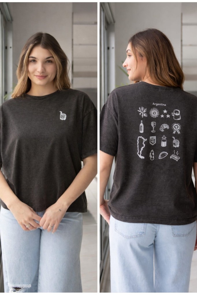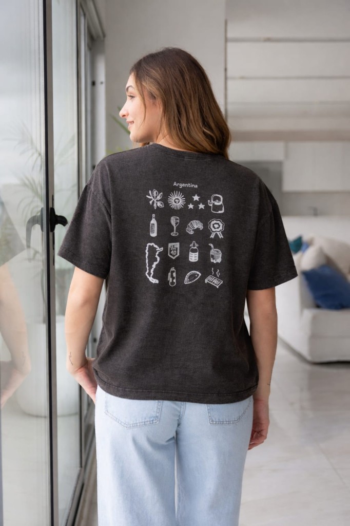 REMERA BOX ESTAMPADA: ARGENTINA TELA: jersey TALLE UNICO: Contorno de busto: 120 cm. Sisa: 25 cm. Largo: 58 cm. Abarca hasta un talle 5 aprox. Las medidas son aproximadas y pueden tener variaciones