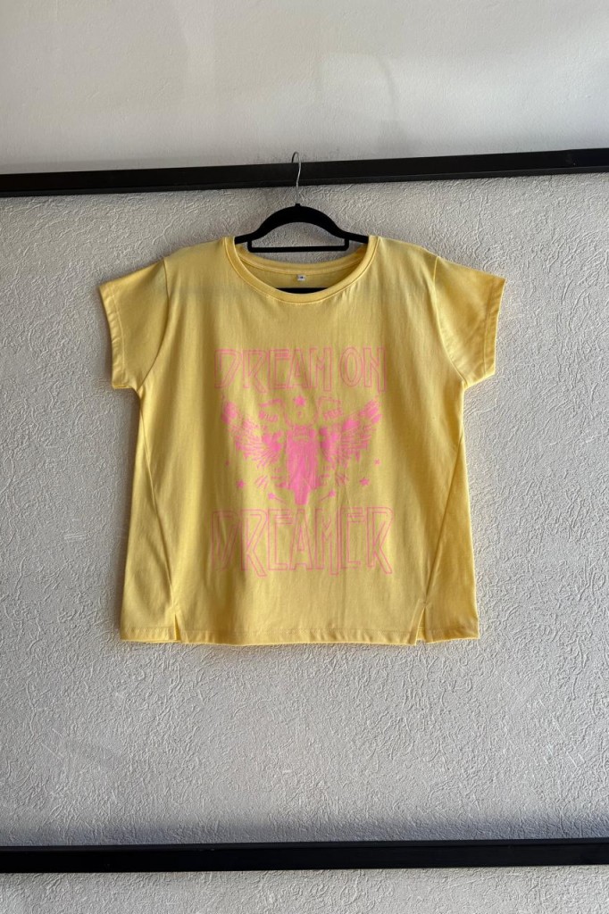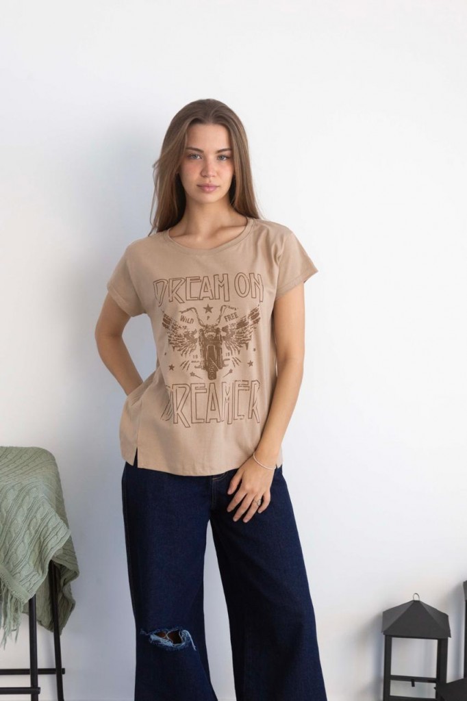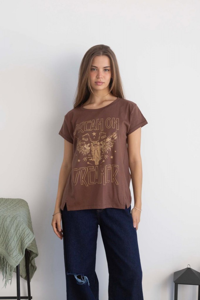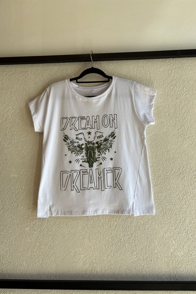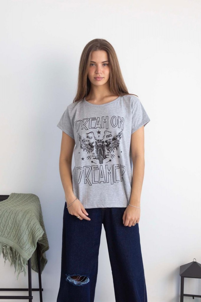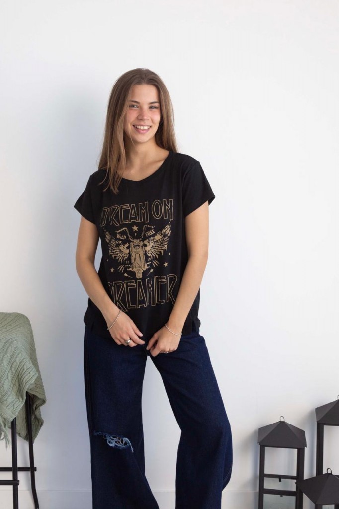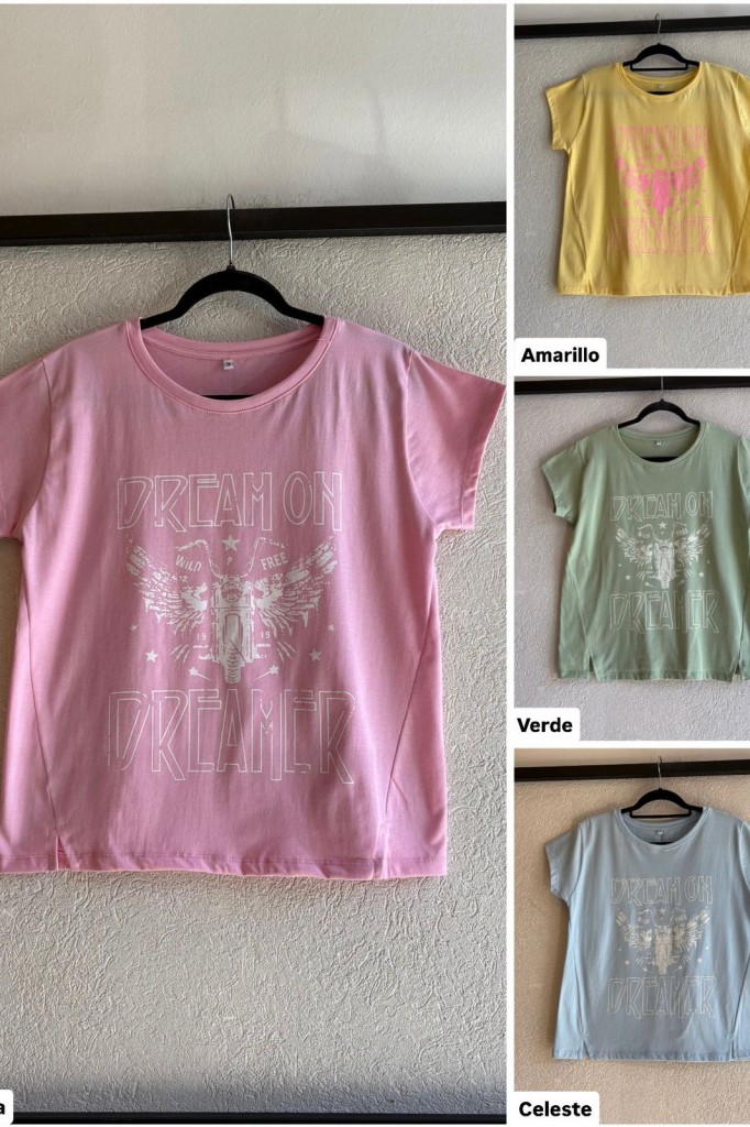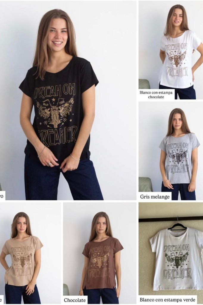 REMERA MALAGA ESTAMPADA: DREAM ON TELA: Jersey peinado TALLE 3: Contorno de busto: 104 cm. Sisa: 23 cm. Largo: 64 cm TALLE 5: Contorno de busto: 116 cm. Sisa: 24 cm. Largo: 66 cm Las medidas son aproximadas y pueden tener variaciones