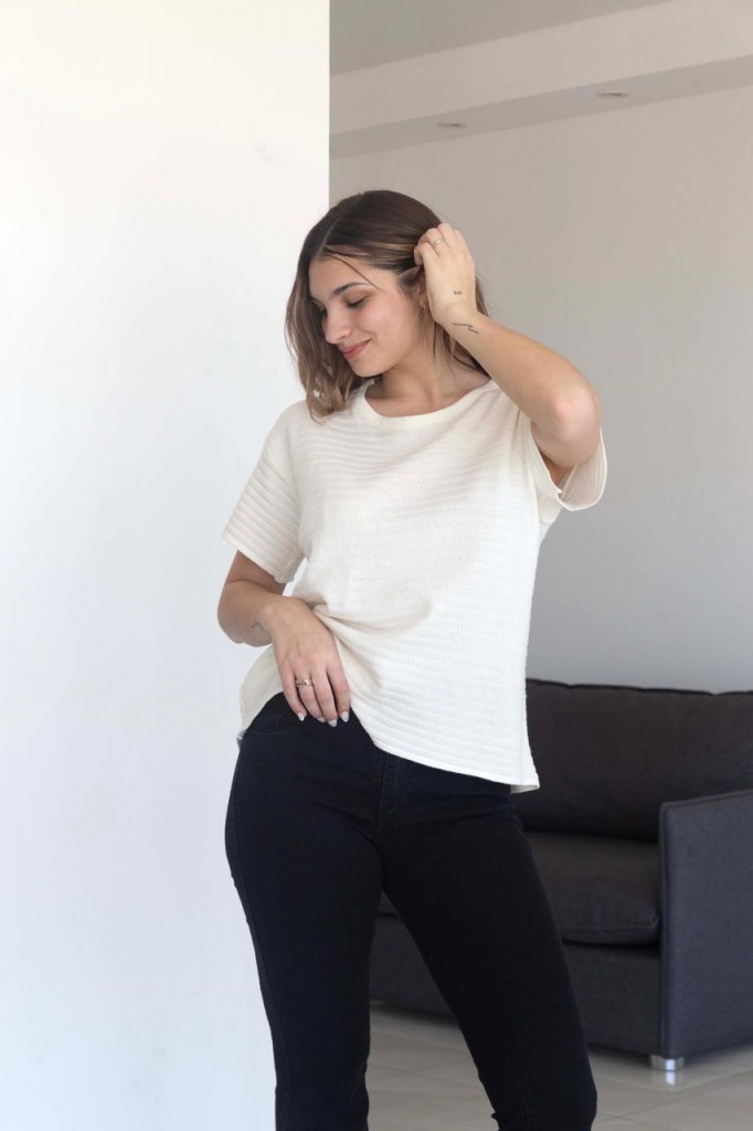 REMERA MERY TELA: hilo bremer TALLE UNICO: Contorno de busto: 116 cm. Sisa: 24 cm. Largo: 58 cm Abarca hasta un 5 aprox. Las medidas son aproximadas y pueden tener variaciones
