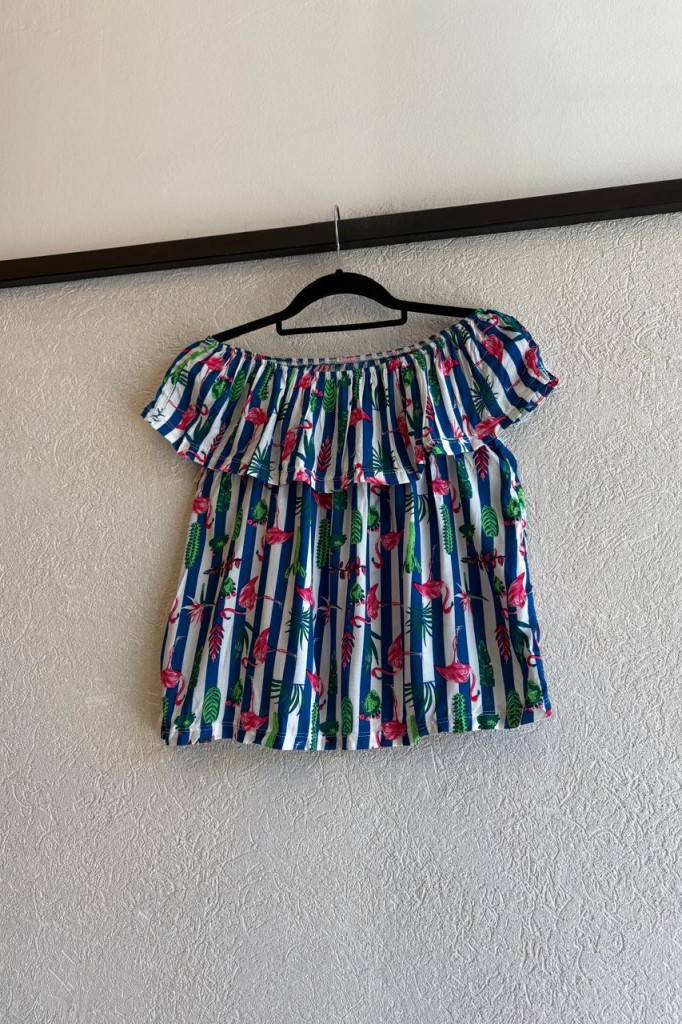 REMERA PAISANITA TELA: fibrana estampada TALLE UNICO: Contorno de busto: 90 cm. Largo: 45 cm. Abarca hasta un talle 2 aprox. Las medidas son aproximadas y pueden tener variación