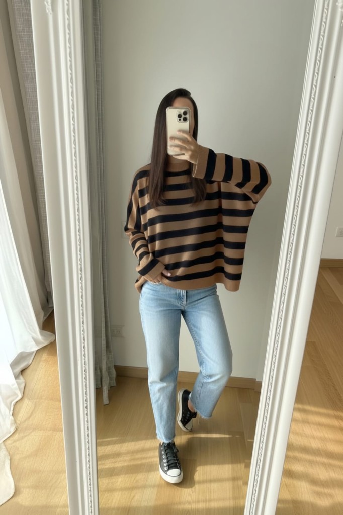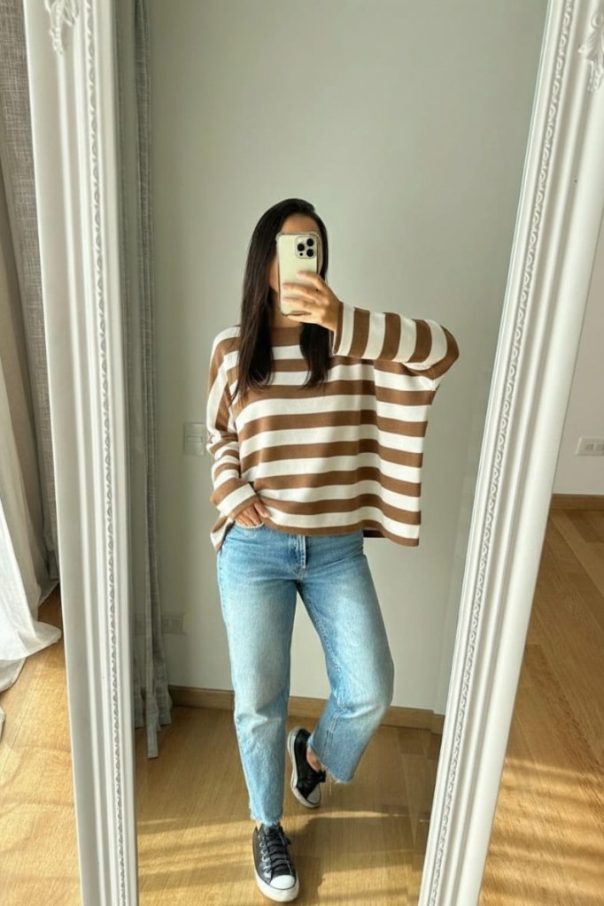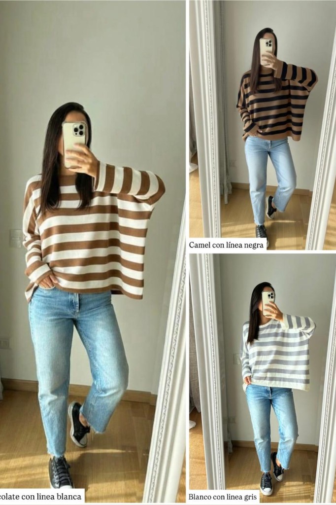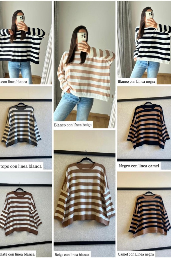 SWEATER DE BREMER RAYADO TELA: Bremer TALLE UNICO: Contorno de busto: 172 cm. Sisa: 32 cm. Largo: 62 cm ABARCA HASTA UN TALLE 6/7 APROX. Las medidas son aproximadas y pueden tener variaciones.