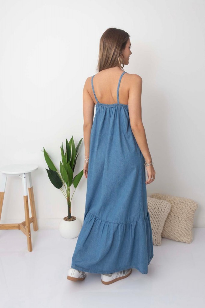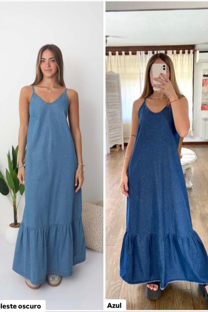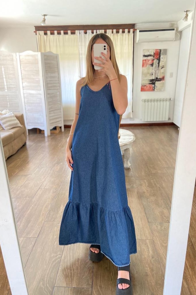 VESTIDO AGUS LARGO TELA: jean TALLE UNICO: Contorno de busto: 80 cm. Sisa: 27 ajustable. Largo con bretel: 143 cm. Largo sin bretel: 130 cm. Abarca hasta un 3 aprox. Debido al proceso de prelavado las medidas y tonos pueden variar.